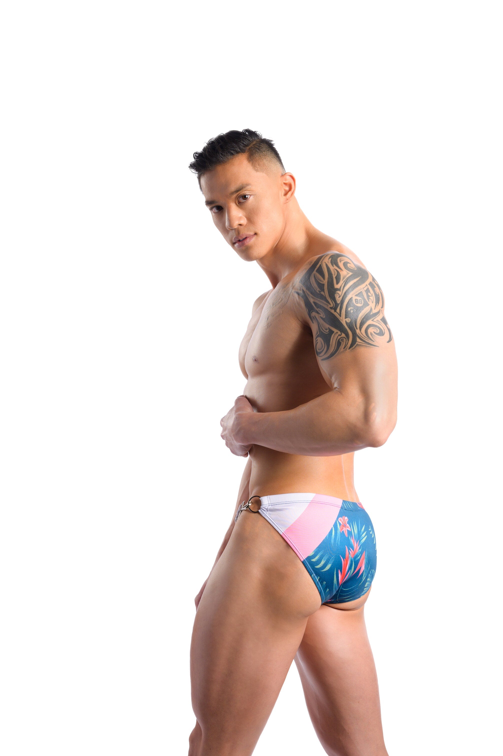 The Wayne Bali Buckled Speedo is your new essential for Beach season with a pallet of Tropical colors and adorned with accents in pink and white. This speedo is made with our highest quality materials, allowing it to dry as quickly as possible. Featuring a secured sexy buckle on the side, you won't have to worry about any embarrassing slips when walking on the beach or diving into the pool.